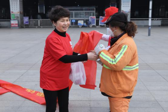 南京妇儿堂医院院长陈琳女士为环卫工送水亲切慰问。